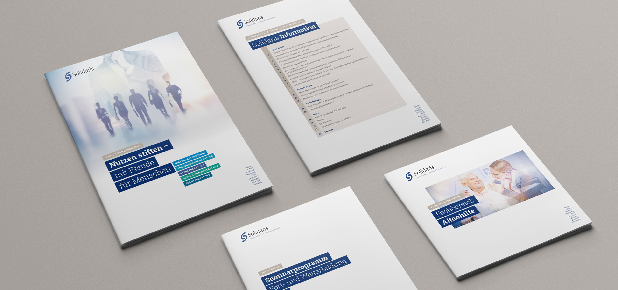 Die Solidaris ist auf die Betreuung gemeinnütziger Träger und Einrichtungen aus dem Gesundheits- und Sozialwesen sowie der freien Wohlfahrtspflege spezialisiert. Als führende Prüfungs- und Beratungsgesellschaft in Deutschland bietet Solidaris an neun Standorten bundesweit zukunftsweisende Expertise in allen wirtschaftlichen und rechtlichen Belangen gemeinnütziger Organisationen unterschiedlicher Größe und Rechtsform aus einer Hand. Auf Basis des neu entwickelten Webdesigns haben wir die neue Gestaltung für den Printbereich entwickelt und umgesetzt.